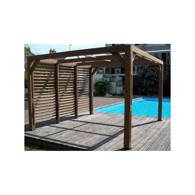 Cet abri de jardin est composé de 4 pieds moisés c’est à dire composés de plusieurs pièces boulonnées entre elles pour une plus grande solidité. La toiture comprend des chevrons à recouvrir avec le matériau de votre choix. Vous disposez d’un brise vue à claire voie à fixer entre les poteaux pour obtenir la fermeture d’une paroi latérale et se protéger d’un vent dominant. Idéal pour filtrer le soleil ou le regard indiscret du voisinage.