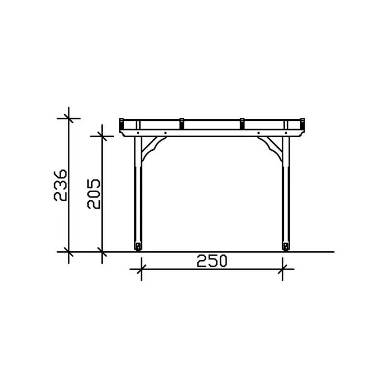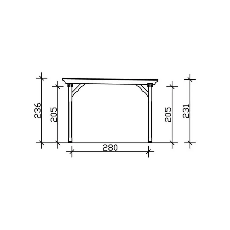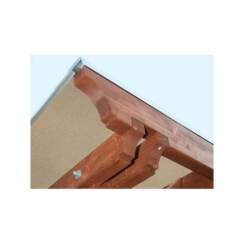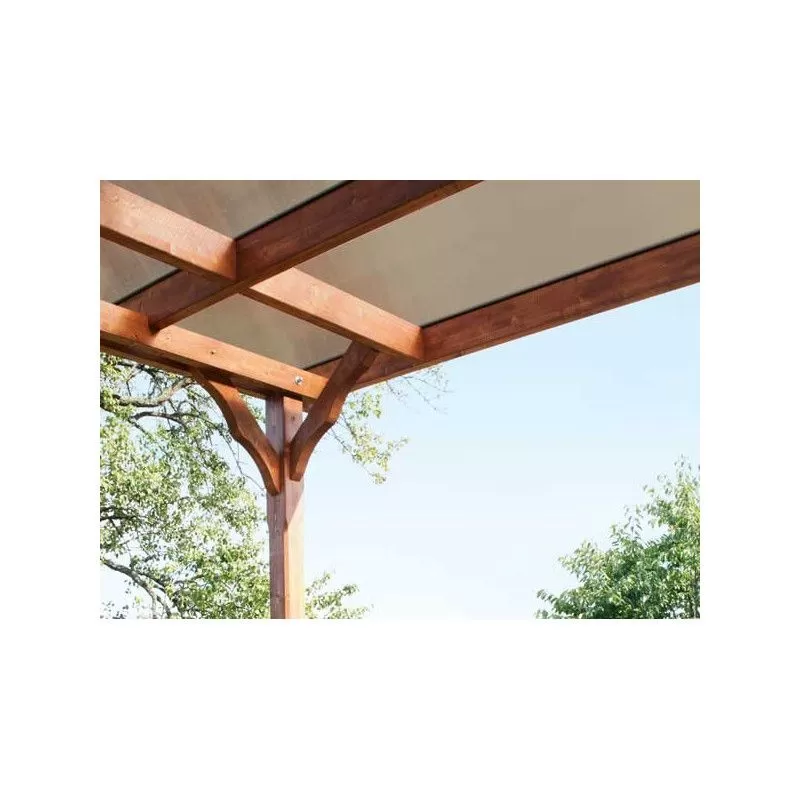 Armature en épicéa lamellé collé, robuste, plus résistante à la torsion et moins susceptible de se fissurer que le bois naturel. La couverture de toit se compose de panneaux alvéolaires en polycarbonate stables de 10 mm d’épaisseur. Leur face supérieure réfléchit les rayons UV. Ils sont fixés au moyen de profilés d’aluminium de haute qualité dotés de joints à lèvre en EPDM (caoutchouc très résistant au fil du temps).
