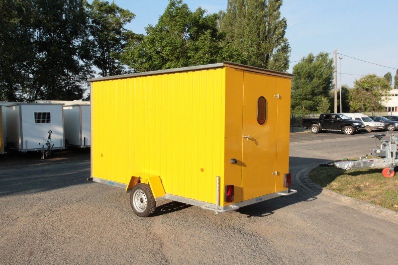 Pour vos chantiers, vous recherchez une remorque abri de chantier économique, mobile, légère, tractable derrière tous les véhicules grâce à son timon articulé, la remorque ECIM AC 35TA 075 SF jaune est faite pour ça.
