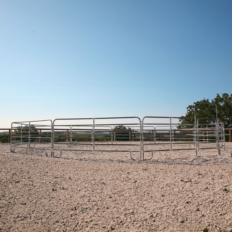 Rond de longe robuste en acier galvanisé, composé de barrières modulaires 3,6 × 1,5 m avec système d’attache par chaînettes pour un montage rapide. Disponible en diamètres 12, 15, 18 ou 20 m, avec porte d’accès incluse. Idéal pour le travail des chevaux en longe, liberté ou débourrage.