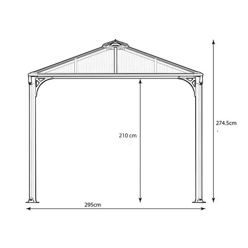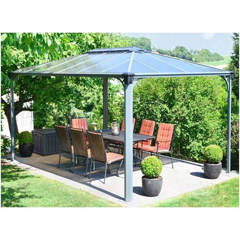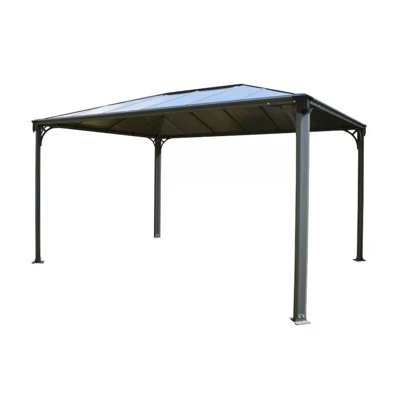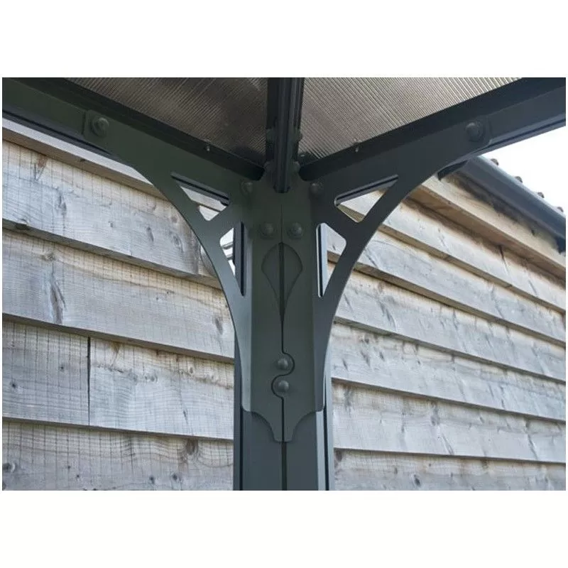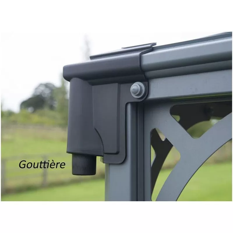 L’armature est en aluminium, laquée gris. Un matériau robuste qui ne rouille pas au fil du temps. A chaque angle vous disposez d’une tête de gouttièrepour vous raccorder et récupérer les eaux de pluie. Ingénieux, les profilés sont équipés d’anneaux vous permettant de fixer des voilages ou des moustiquaires. La couverture en polycarbonate filtre efficacement le rayonnement ultra violet. Pour éviter l’effet de serre le chapeau de toit est muni d’ouverturespour ventiler l’abri. Ces ouvertures permettent d’éviter qu’une bourrasque de vent ne s’engouffre sous la toiture.